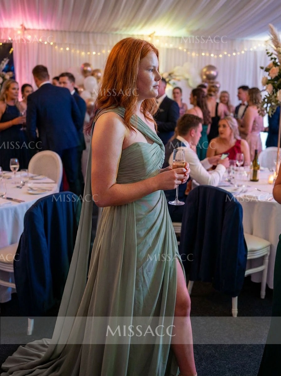 Stunning A-line Chiffon Prom Dress with Asymmetrical Sleeveless Design and Split Front adds a chic touch to any special occasion. Perfect for proms, parties, and elegant events.