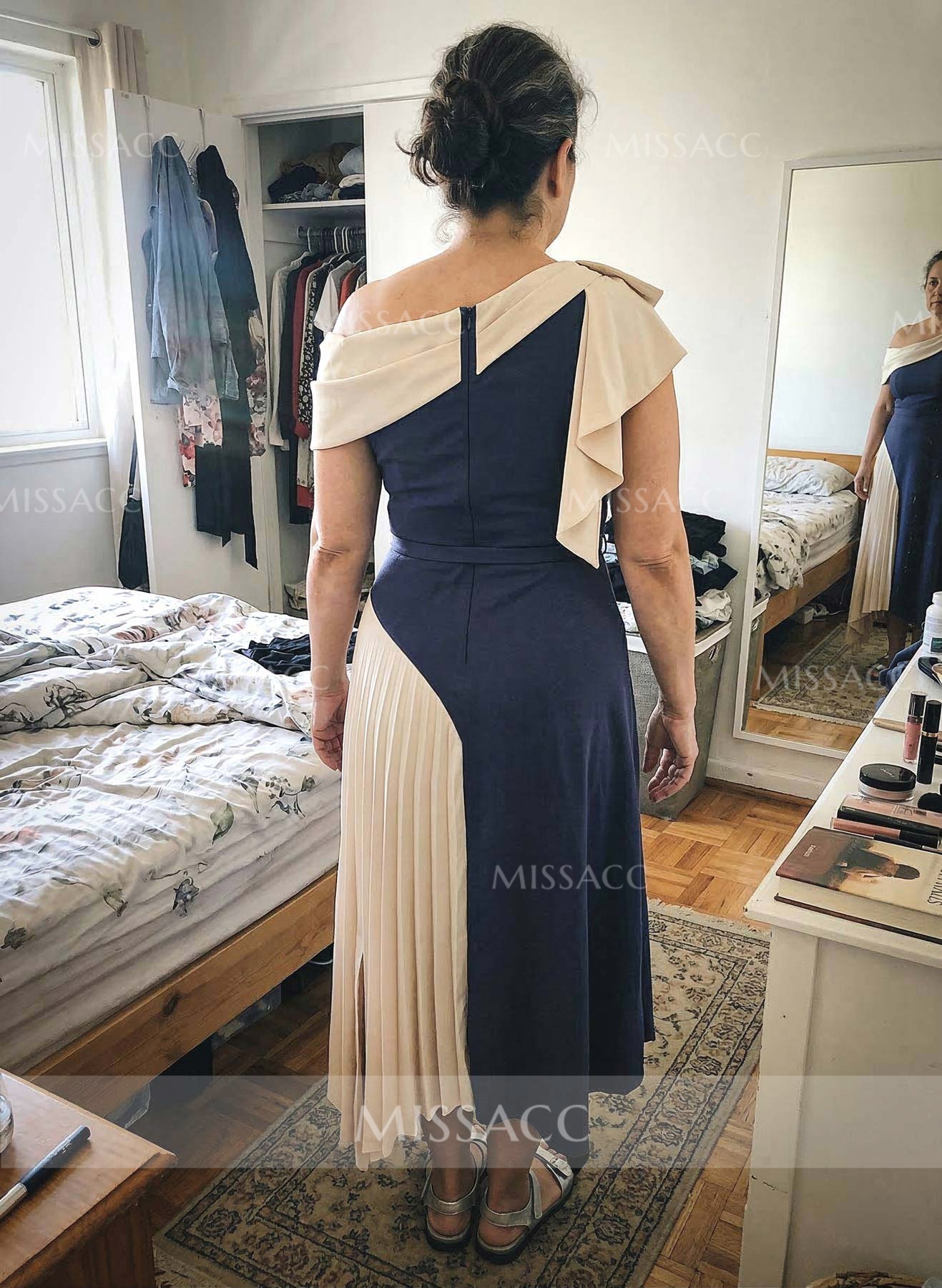 Wore this for our 25th anniversary dinner. The one shoulder look is very flattering and it didn't slip down at all. A few threads were loose near the hem, but nothing a quick snip couldn't fix. Overall a solid purchase that I will probably wear again.