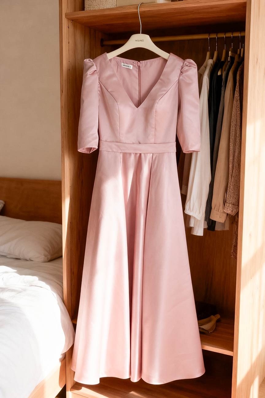 This dress is just what I was looking for! I bought it for a wedding I'm attending next month, and the satin fabric feels really nice and looks way more expensive than it was. The neckline is flattering, and I love the length – perfect for a more formal event without being too over the top. I'm really happy with this purchase. It arrived pretty quickly too, which was a bonus.