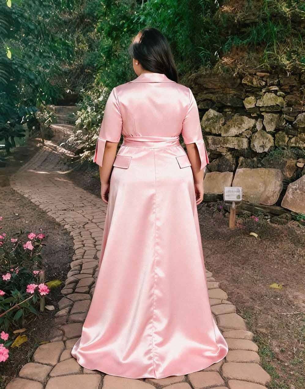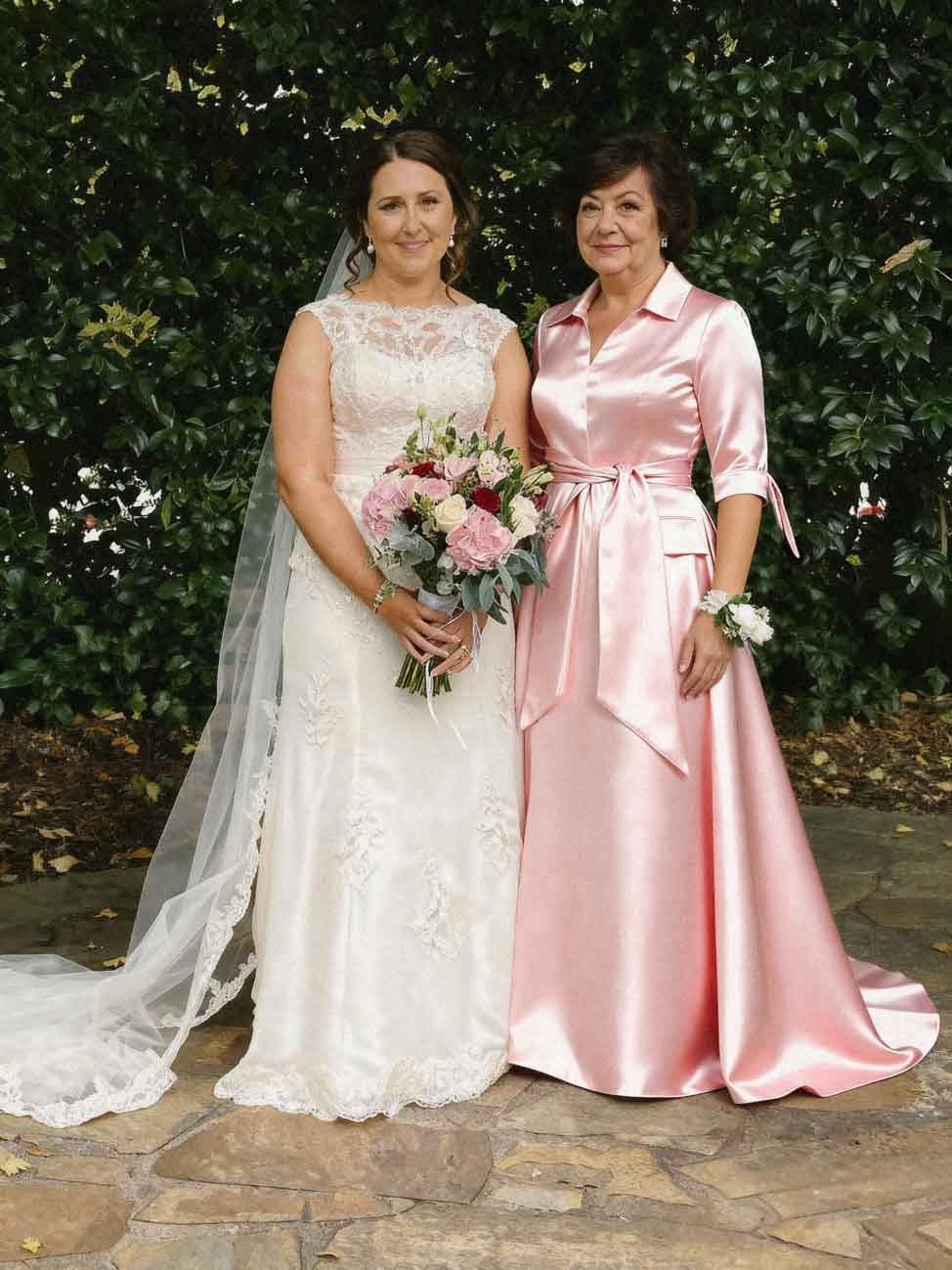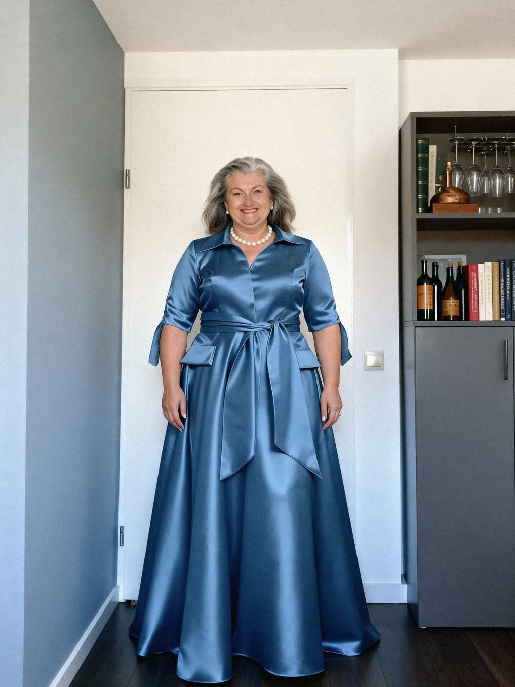 "Charming A-line V-neck Satin Mother of the Bride Dress with Sash, perfect for elegant wedding events."