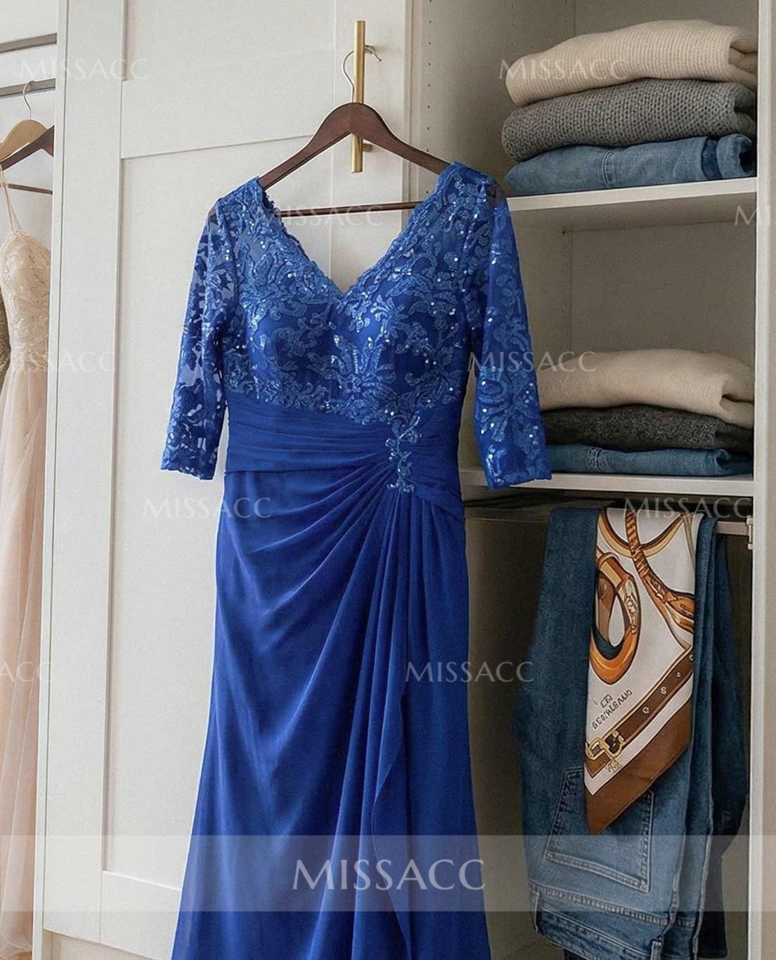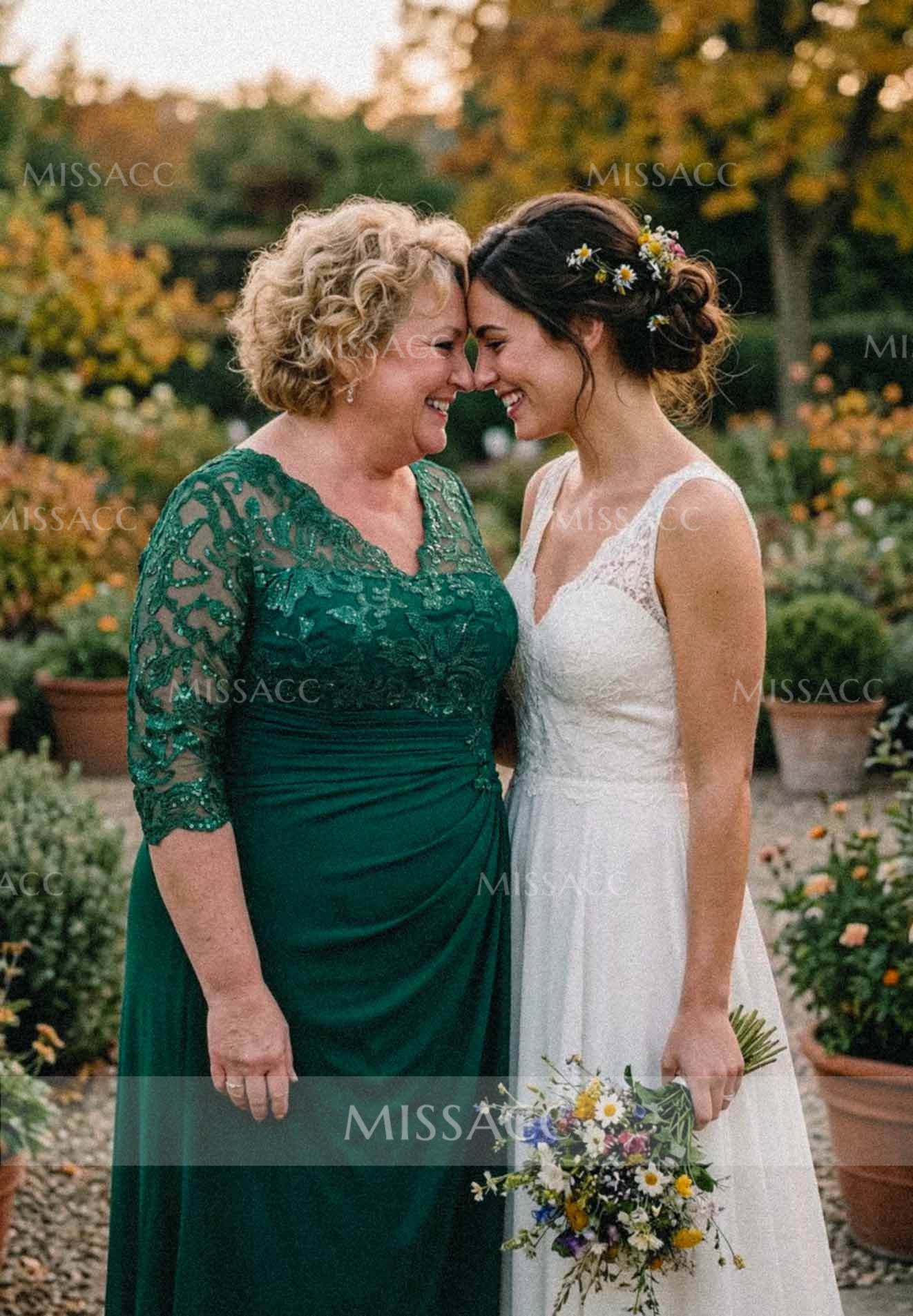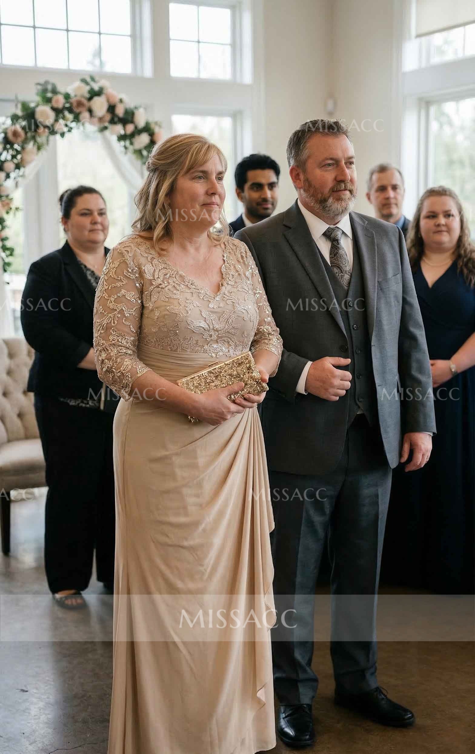 Stunning A-line V-neck Mother of the Bride dress with lace and sequins, perfect for a glamorous wedding event. Floor-length chiffon adds a touch of elegance to this exquisite design.