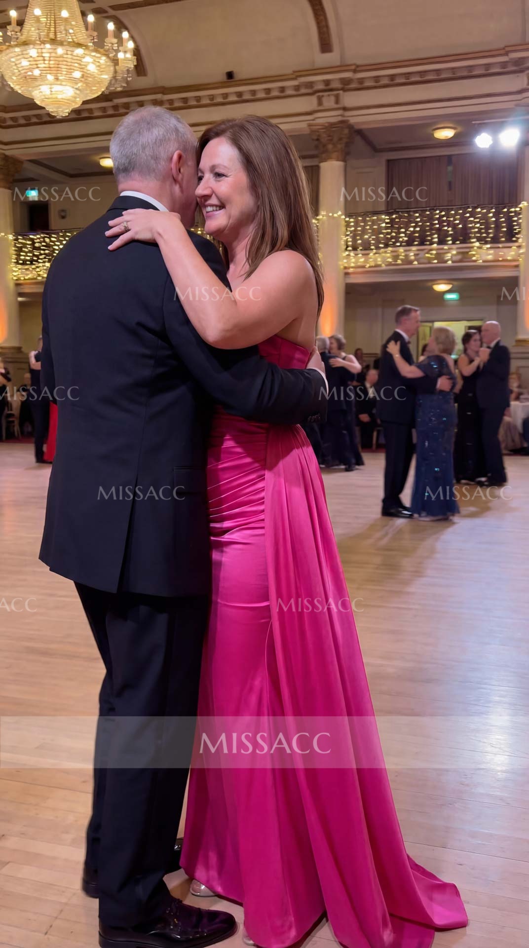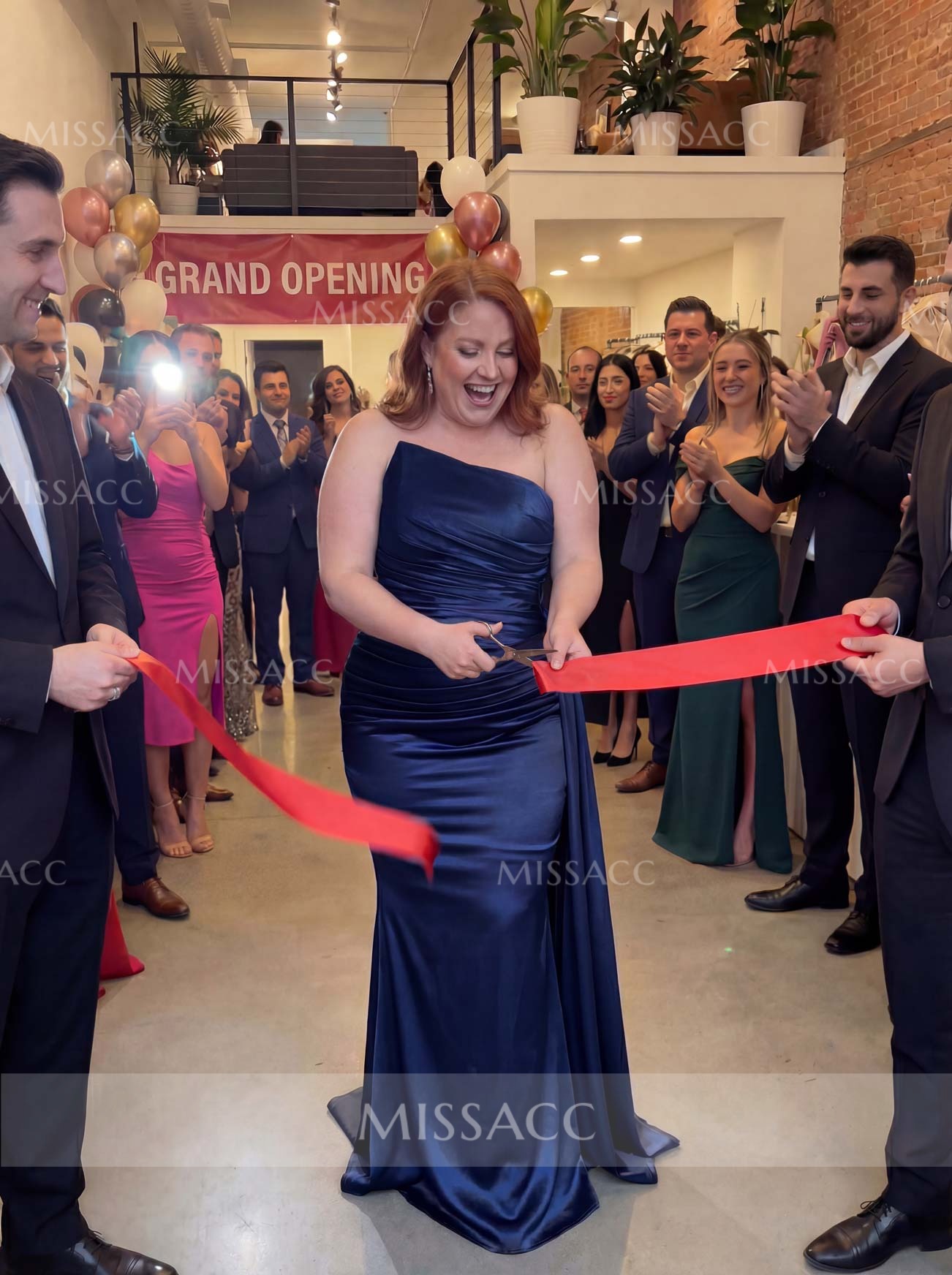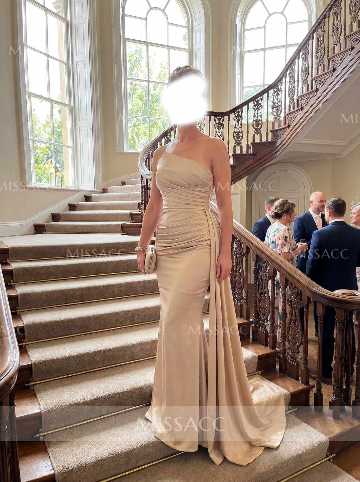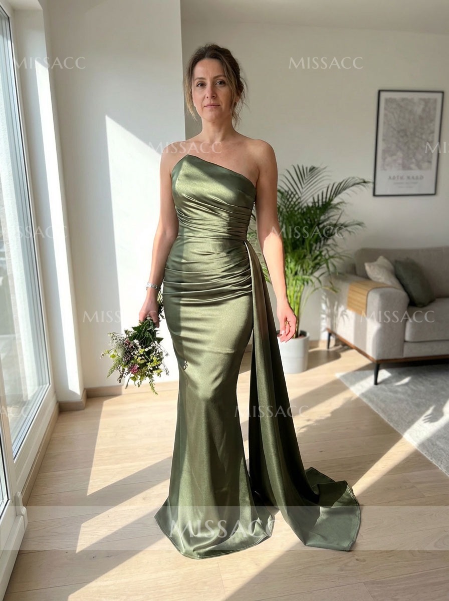 Stunning mermaid silhouette with asymmetrical sleeve, this satin evening dress offers a chic look for special occasions. Luxurious feel, elegantly crafted.